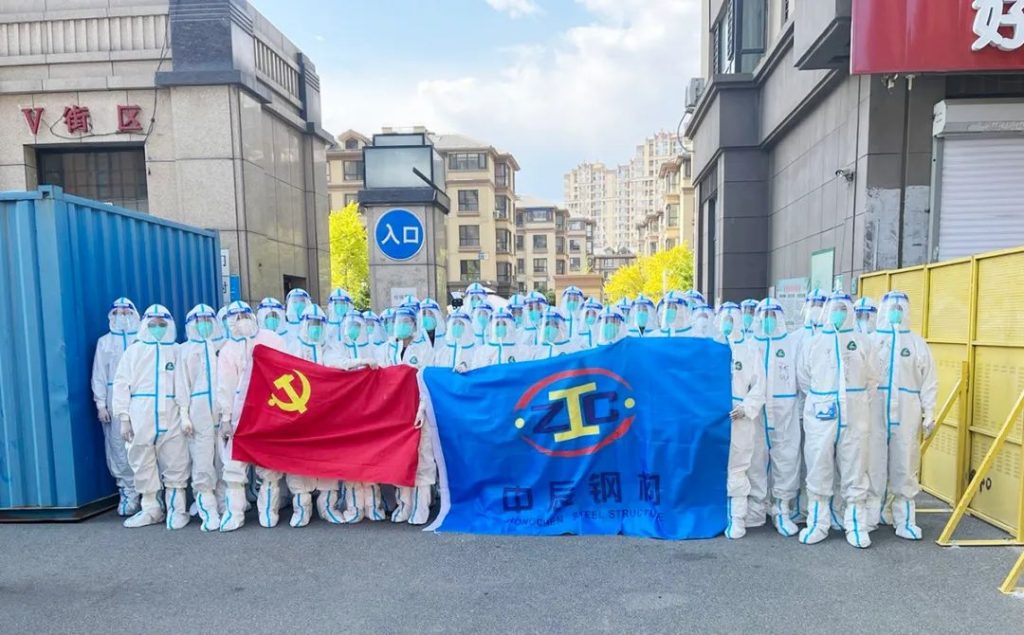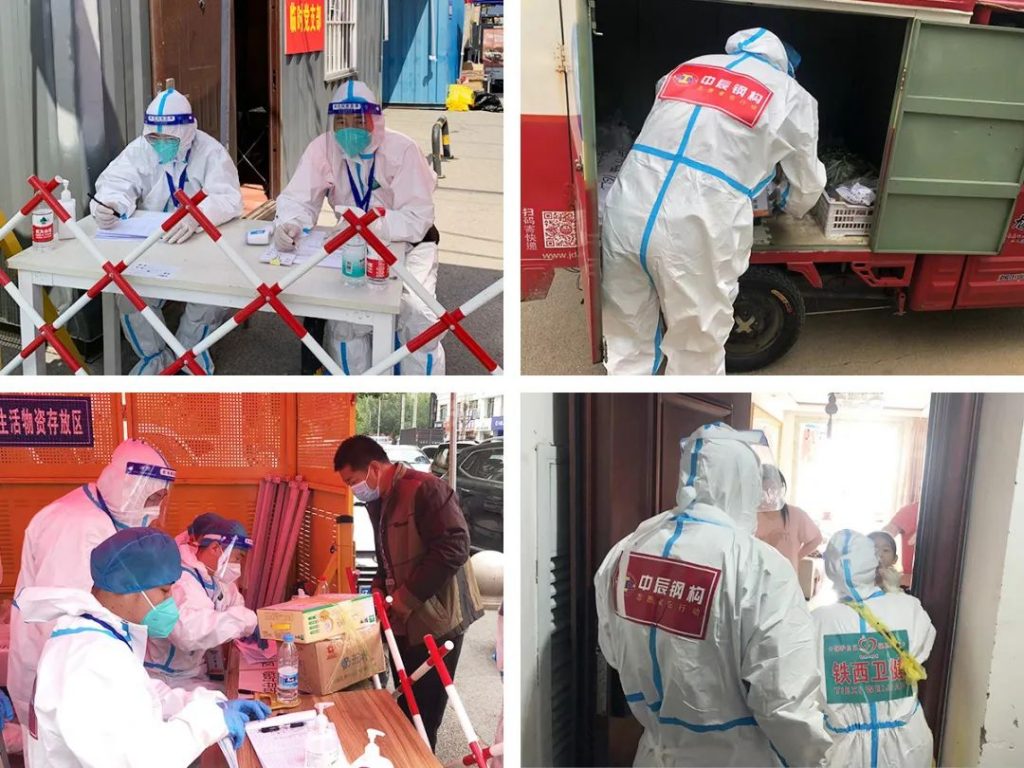 5月15日上午,鐵西區(qū)出現(xiàn)一例新冠疫情,中辰鋼構(gòu)按照服從區(qū)委、區(qū)政府防控指揮安排,立即從各工作崗位抽調(diào)50名志愿者,盡銳出“戰(zhàn)”,于當(dāng)日中午就進(jìn)駐指定園區(qū)開展志愿服務(wù),歷時(shí)12天,圓滿完成任務(wù),再次展現(xiàn)出了守望相助,同心抗疫,甘于奉獻(xiàn),樂于擔(dān)當(dāng)?shù)拿衿髶?dān)當(dāng)。